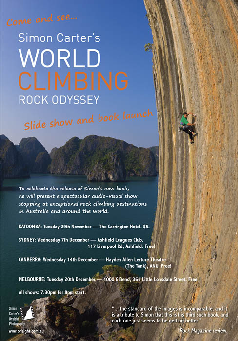 The show will be a spectacular audio-visual show stopping at some exceptional rock climbing destinations from Australia and around the world. I’ll also do a book signing, so if you’d like to get hold of Rock Odyssey it will be the perfect opportunity (they will be available at a discounted price on the night).