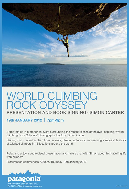 The show must go on! I’m presenting my World Climbing: Rock Odyssey audio-visual show in Sydney this Thursday night at the Patagonia store in the city (93 Bathurst Street, from 7pm). And it’s free. I’ll also sign books for anyone who’d like to score a copy on the night. For anyone who missed the show last time, I hope you can make it and I look forward to seeing you there!