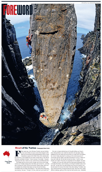 Fifteen years ago, when Monique Forestier was just starting out as a rock climber, she saw a photo that changed her life. Taken by the renowned climbing photographer Simon Carter, it depicted an ascent of the Totem Pole, a 65m dolerite pillar that rises like a cruise missile from the ocean at Cape Hauy on the Tasman Peninsula, southeast of Hobart. “It blew me away,†she recalls. “I thought, ‘Those guys are crazy. There’s no way I could ever do something like that.’â€