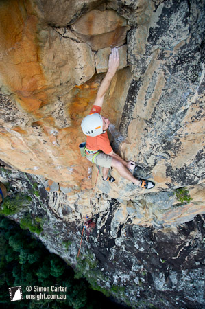 John O’Brien nails the throw first shot to save Lee Cujes from being stranded off his A Gaze Blank and Pitiless as the Sun (30), Summit Caves, Mount Tibrogargan.