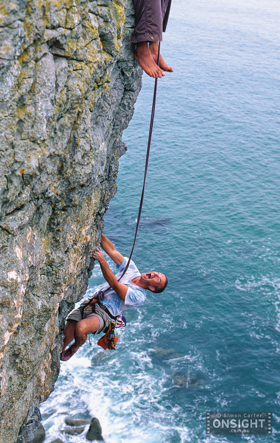 Steve Monks baited up Fascist and Me by Mike Week’s tender toes… The route is a two pitch E3, 5C at #Pembroke, Wales, UK.