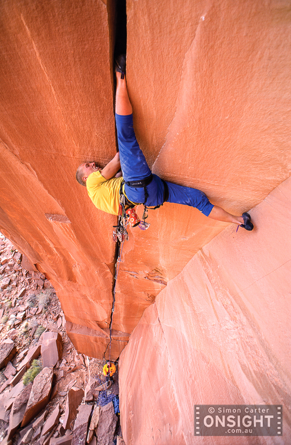 @rockandicemag for their photo annual. We were at Indian Creek, Utah, and John Varco told us about this crazy off-width that he’d climbed, a route no nauseatingly exhausting that it was aptly named Belly Full of Bad Berries (5.13a/b). Sounded um, interesting… So we headed up there, set up my rope, I got in position and John started climbing, errr… thrutching, up the crack. This was back in the days of film and before long I’d shot off a whole roll, so I quickly did a film change on the fly while John was still climbing, and then I shot that whole roll off as well. It was then that I realised that in the time that I’d shot TWO whole rolls of film, for all John’s thrutching he’d just managed to move less than ONE meter up the climb! And that was when I cracked up laughing!