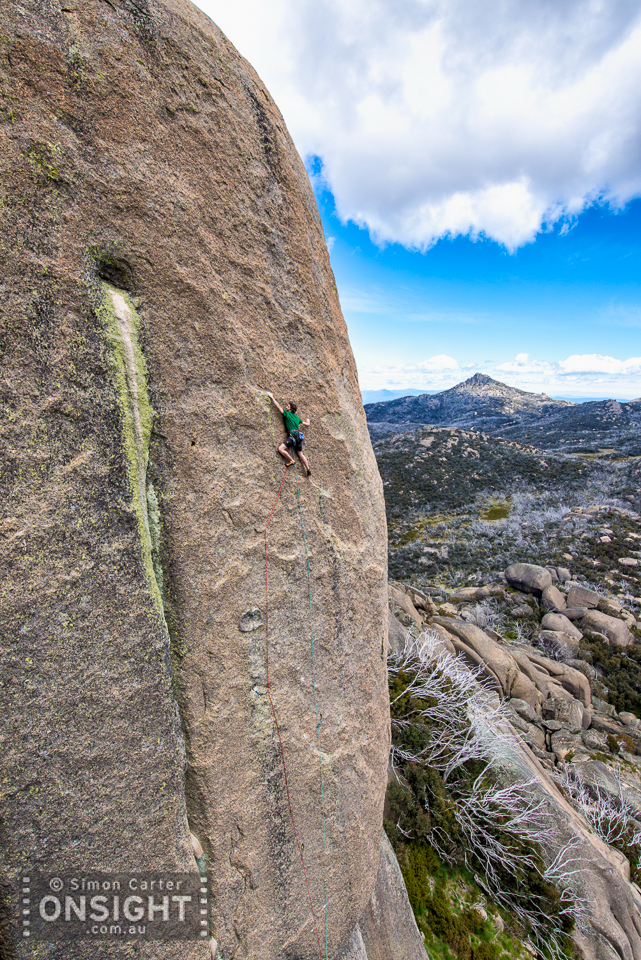 Peter Wyllie leading the brilliant granite face climb Redbacks (23), on The Hump, at that great summer destination Mt Buffalo.
