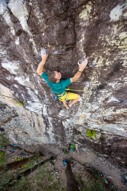 Rob Saunders cranking till his fingers bleed on Bikinitown Direct (25) at Pages Pinnacle, Gold Coast, Queensland.