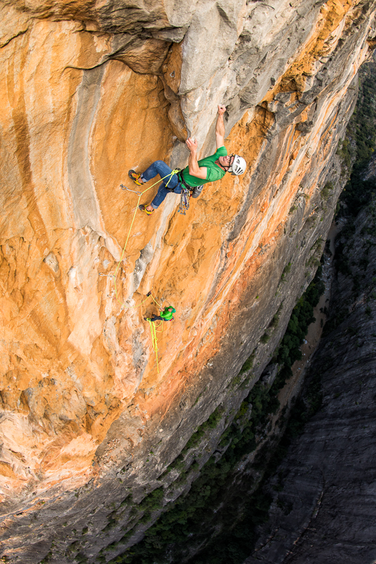 Chris Ling high up on the South Wall of Bungonia Gorge, with Damian Jovanovic belaying, on pitch 7 of The Bridge to Total Freedom (22, 23, 19, 22, 23, 23, 26).