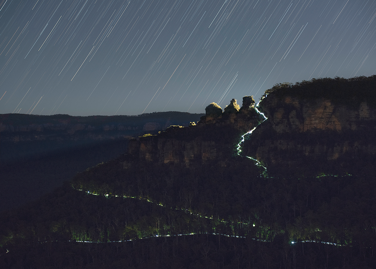 This is my “Ultratrail Light Trails” pic for this year. The runners coming down the Giant Staircase next to the Three Sisters are approximately 62km into the fun, whereas the runners down in the Jamison Valley are heading to the finish, with only four to six kilometers left of the 100km course.