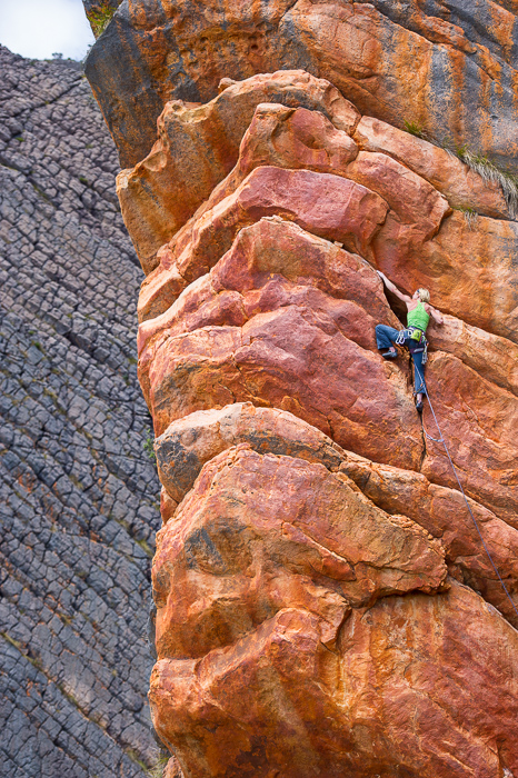 Climber on Archimedes Principle (25) on Eureka Wall, on of the best trad climbs in the country.