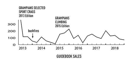 Apparently, the Grampians have experienced astronomical “growth of climbing”. Parks Victoria cited some figures to back it up (80,000 climbers per year), but who knows where they got that figure because it’s certainly not right. And it’s certainly not 20% year-on-year either. How do you actually measure the growth of climbing in the Grampians? Well, as publisher of the main guidebook, I’m one of the few people who would actually know. Checking the guidebook sales for the last six years since we started, the sales are not going up. Here you go, I’ll share it with you all: