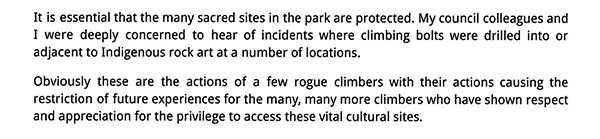 This is significant because the “bolts-in-rock-art” accusation is one of Park’s cornerstone arguments to justify the Grampians climbing bans. It is significant because this false accusation has become accepted as “fact” and may well be influencing decision making at the highest levels. Here is a snippet from a letter from the Mayor of Northern Grampians Shire (Stawell) to the Minister for the Environment: