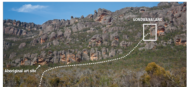 In the south west Grampians walkers started hiking up to the iconic Fortress from the west well before the park was established. Government contribution at this time was to bulldoze fire breaks and logging roads right up to the Fortress from the east. The cultural sites near Buandik were severely compromised by the establishment of the Billywing pine plantation, with fire breaks leading right up to the significant outcrops. This resulted in the damage necessitating cages.
