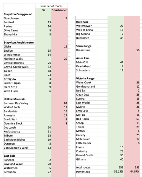Why are the SPAs now banned? That’s a good question. Areas are designated for “Special Protection” for environmental and/or cultural heritage reasons but in the areas where climbing is banned we’ve been kept in the dark about what exactly the reasons are. When you drive up the Great Western Highway from Melbourne to Horsham you drive through a SPA at Dadwell’s Bridge, about 200m north from the Giant Koala tourist attraction; climbing here is banned but a highway is ok it would seem. Commercial climbing (commercial groups) are still being allowed to operate in SPAs – so it’s recreational climbers who are being targeted. The mechanism for the bans is there, apparently, in the 2003 Management Plan and it seems no one bothered to question or challenge it at the time. Actually, if you look at management plan Table 3 indicated that the SPAs are less than 1% of the park, how that suddenly became 33% I don’t know. Anyway, the fact that climbers had been climbing in these areas for decades BEFORE then — and SINCE then — without any great problems, has been completely ignored.