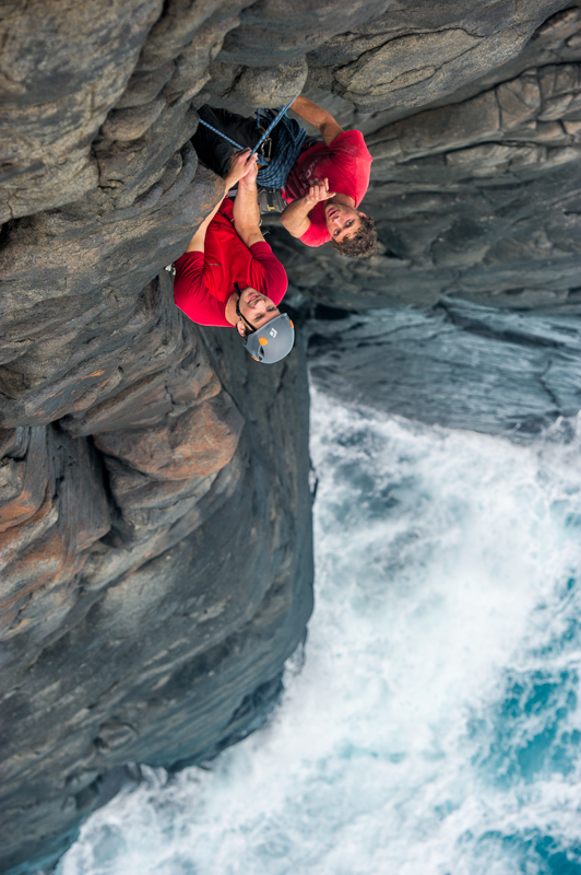 This is Adam Straw (left) and Jean-Philippe Dumas at the belay, Training for Big Walls (19,18), Southern Ocean Wall, West Cape Howe, Western Australia.
