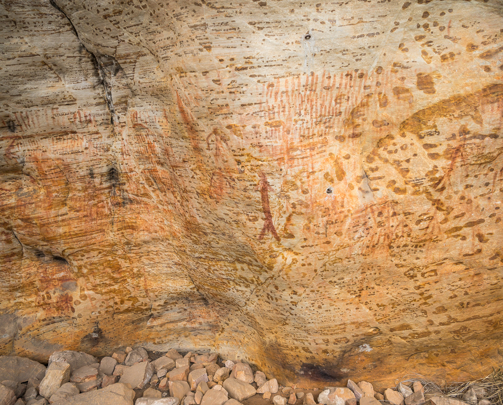 But then an interesting thing happened after the meeting. As I was packing up a long-bearded fellow with the name tag “Ben” came up to me and told me I was wrong about the “bolt-in-rock-art” thing. He was saying climbers had in fact placed bolts into art. Holding his hands out about shoulder-width apart, he said something like: “I’d say that’s close enough to be ‘in art’, wouldn’t you?”. I quickly established the man was Ben Gunn, who I knew to be an archaeologist who has done Cultural Heritage work in the area. I was most intrigued.