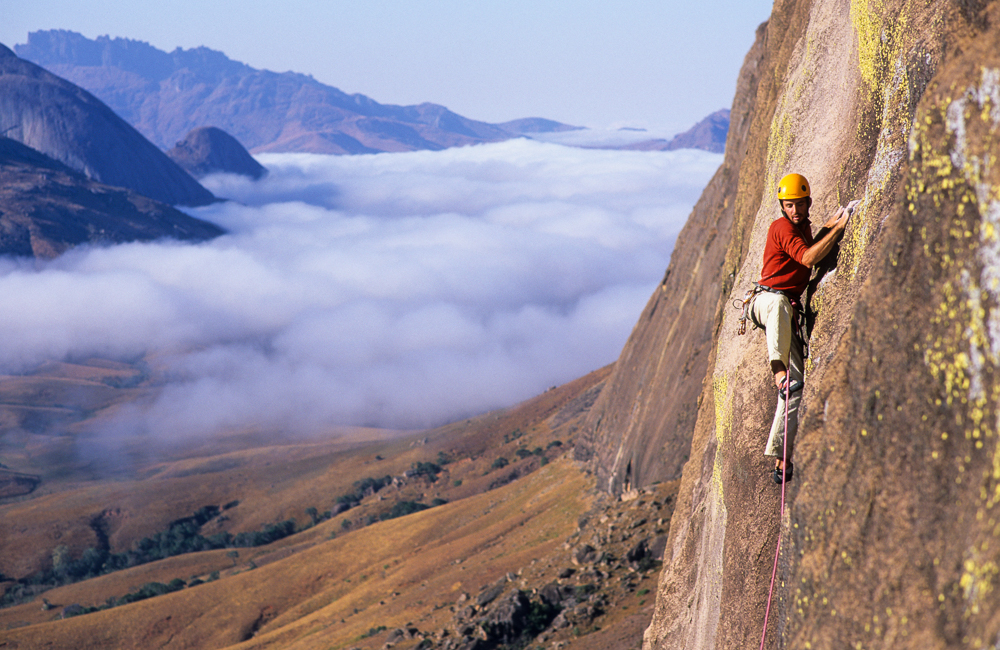 Felix Frieder leading pitch 9 of Manara-Potsiny (8a), 600m (18 pitches) on Tsaranoro Be, Tsaranoro, Madagascar. A route established ground up by Toni Lamprecht, Benno Wagner and Felix in 2007.