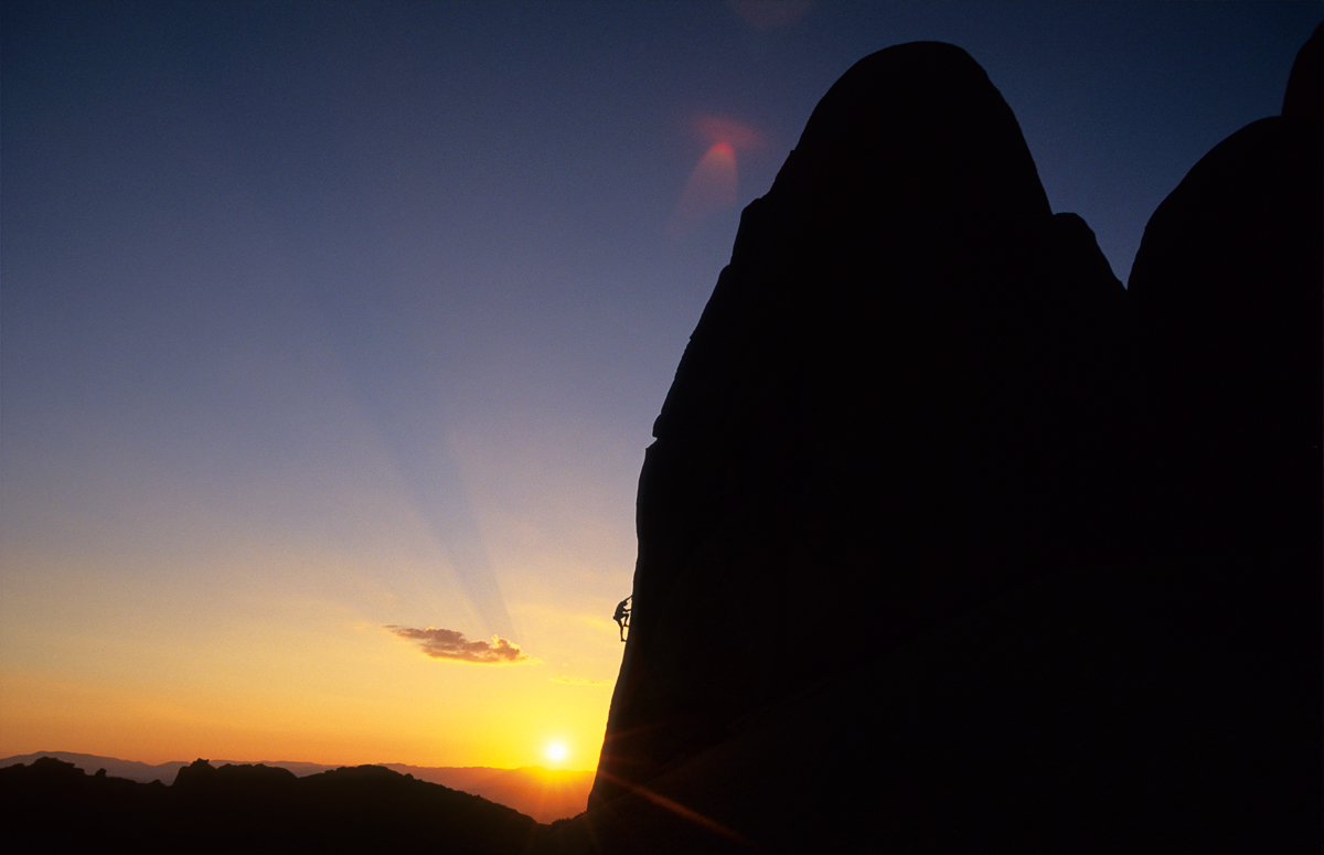Tim Day greets the dawn with his Cowboy Logic (23), the Cathedral, Mount Buffalo, Victoria, Australia. Nikon F100 with 20mm f2.8 lens. Fuji Velvia film.⁠