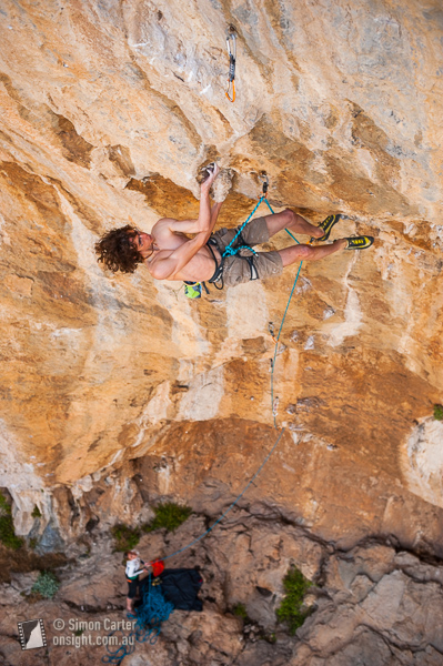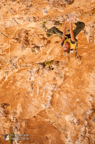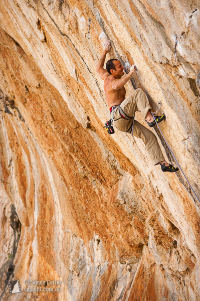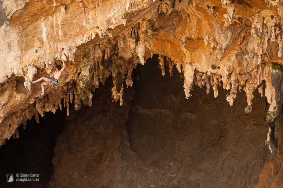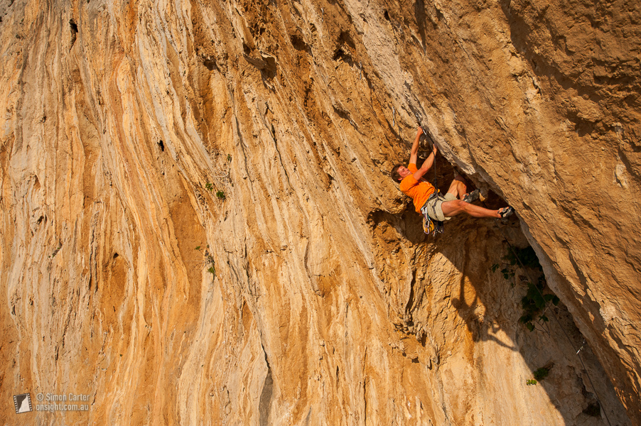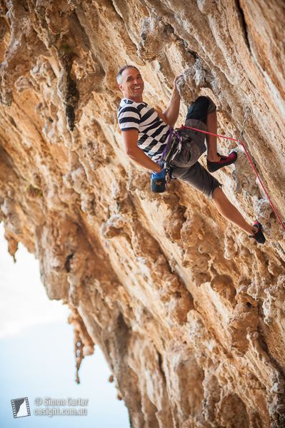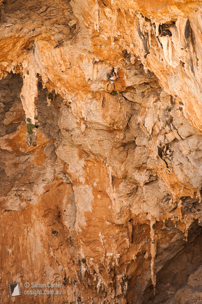 I’m pumped, insanely pumped, with my legs wrapped around a twisted stalactite, frantically swapping hands, shaking out, trying to get a little something back. I contemplate the next sprint through the bewildering three dimensional tufa jungle — and I’m only half way there. But then, feeling like a cheeky monkey, a smile creeps across my face as I realise that life doesn’t get much better than this. And, what’s more, we have two more weeks left at this sport climbing nirvana! I feel like I’ve cashed in all of my frequent flyer belay bunny points, passed through the pearly gates, and gone straight to heaven.