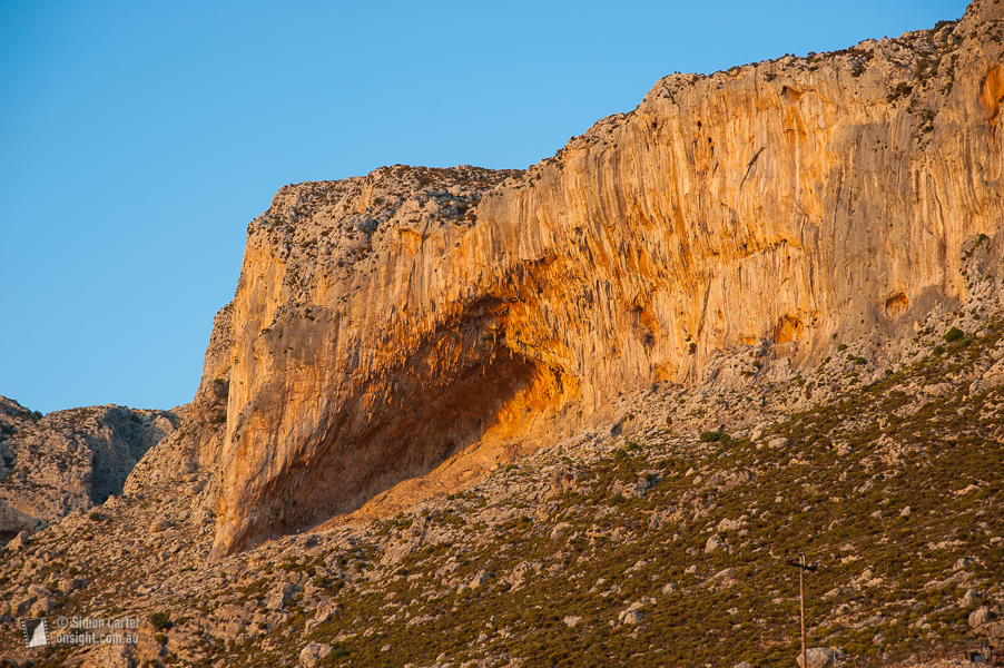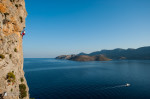 Kalymnos is not the only island of interest to climbers here. The ever-present Telendos Island is impossible to ignore and your belayer’s head will inevitably be crooned in that direction when it shouldn’t be. Like a giant magnet, your eye constantly flicks back to its direction as if it were true north. The cone shaped island is also a sundial by which you measure the passing of the day: illuminated by the soft morning light, you watch the shadows lengthen, and the end of your climbing day is marked by the glowing orange sun melting into the sea behind it. Telendos has incredible new route potential on big cliffs but, with so much to do on Kalymnos, the ten-minute ferry ride has been enough to slow development until recently. Now Telendos has several sectors ready and rearing to go along with some moderate multi-pitch sport routes — which complement the range of other worldly experiences.