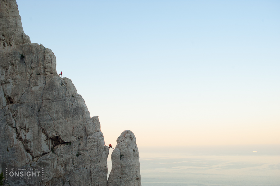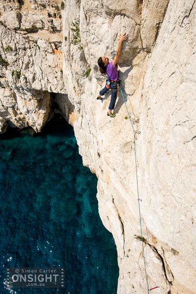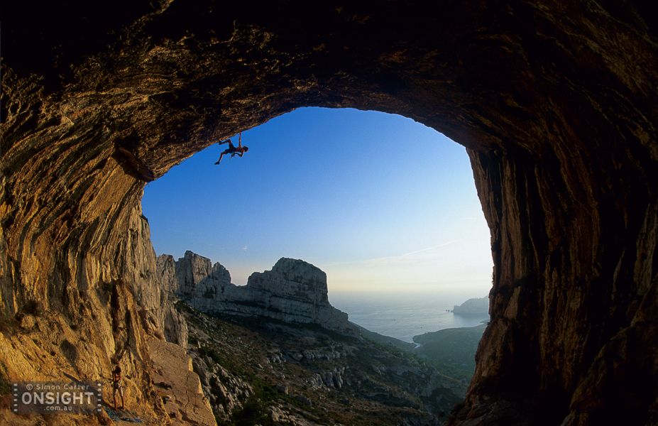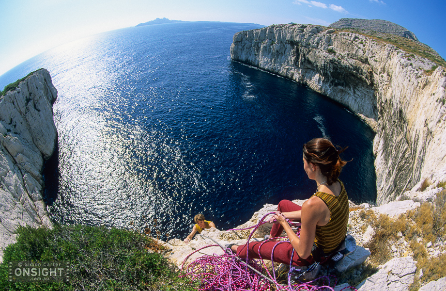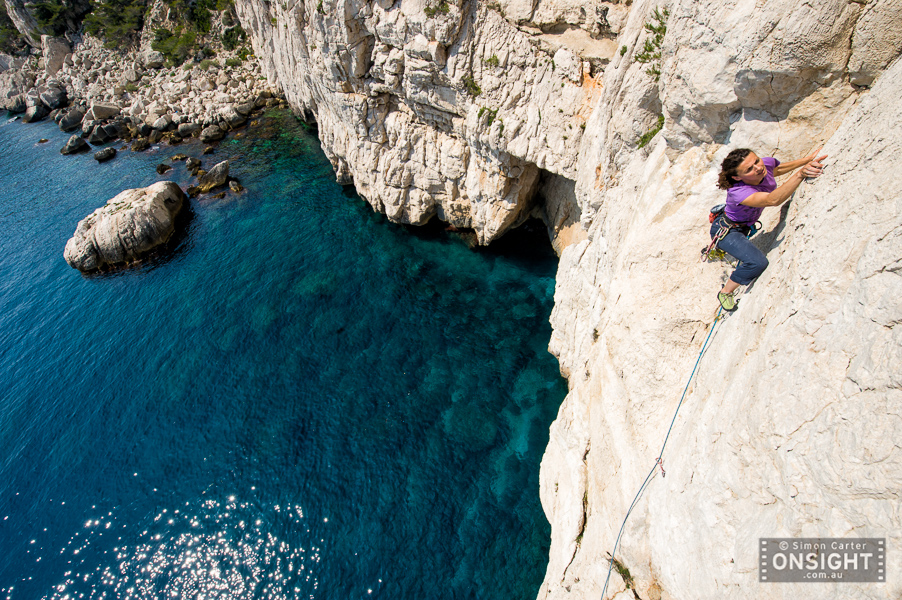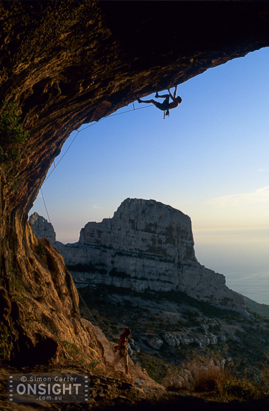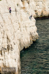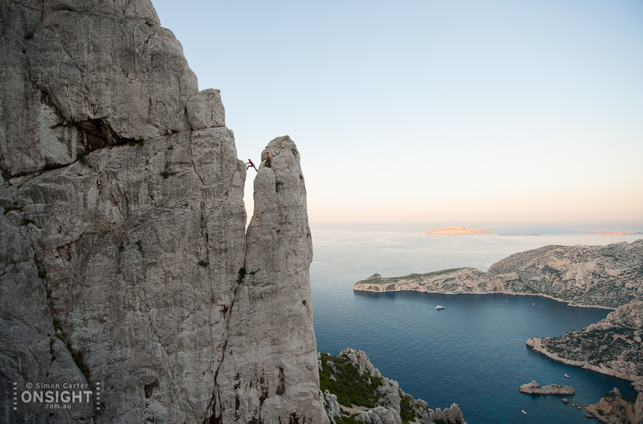 Sunrise finds Nadine Rousselot and Mathieu Geoffray an hours hike in and two pitches up Arête de Marseille (5c). It is a five pitch Calanque’s classic first climbed in 1927, on La Grande Candelle, overlooking the Mediterranean, France.To really squeeze the most out of Les Calanques you can combine its natural beauty with its climbing delights. At En Vau, enjoy the pleasures of multi-pitching knowing that a tantalising swim awaits nearby. At Goudes, take a wild ride along the lip of its cave and be marinated in the sun as it slips toward the horizon. La Triperie’s vanilla white cliffs lining the inside of a horseshoe showcase super-technical climbing high above the shimmering sea. And there’s no better way to get wet than with some deep-water soloing, being swallowed up by the soothing aquamarine depths is mild punishment for a failed attempt.
