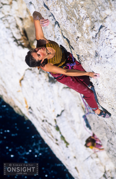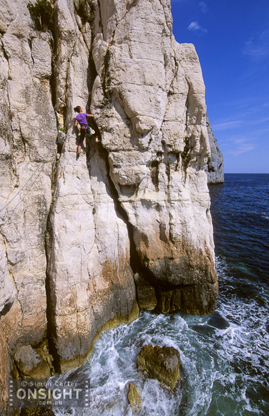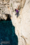 A naked bather nearby is unaware of us until we start giggling like schoolgirls. My dear friend, Nadine Rousselot and I have been traversing, crab-like, just above the supralittoral zone on perfect albino limestone for four lovely pitches. It’s hot as you would expect in mid June. I’m being cooked; my eyeballs are like fried eggs, and my feet, like sausages on a BBQ, are about to split and explode. Thankfully, we soon enter the shade, suspended under a roof, where the cool rock soothes my pains. I’d really like to hang around but the bombarding waves herald some urgency to complete the neat little adventure we’d started, La Commune.