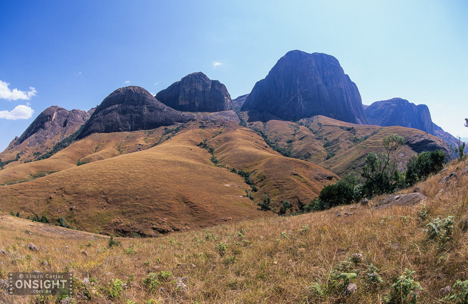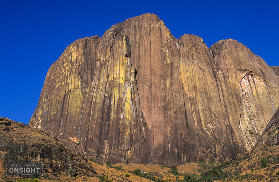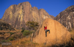 The Tsaranoro massif with The Karambony to the right, Tsaranoro, in the southern highlands of Madagascar.Tsaranoro Massif’s black and orange streaked cliffs, with distinctive sparkling green highlights, forms an imposing crown towering 800 metres above the surrounding plains. The first route, Rain Boto (7b+) was climbed by big wall veterans Kurt Albert and Bernd Arnold in 1995. Today there are over fifty free climbs between 6a and 8c+. The true beauty of this place has got to be multi-pitch moderate (and hard) classics tackling the big walls with superlative quality climbing.