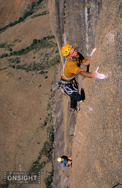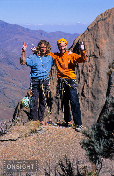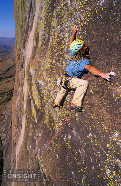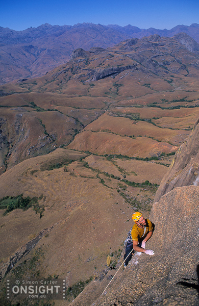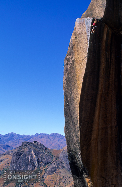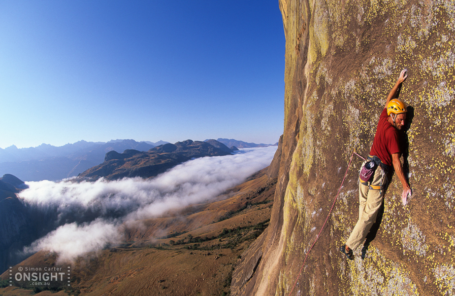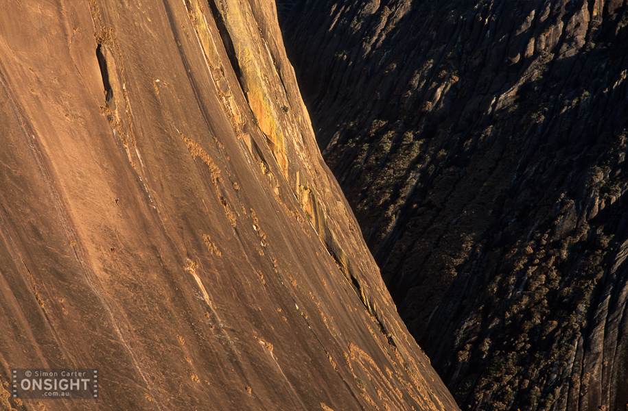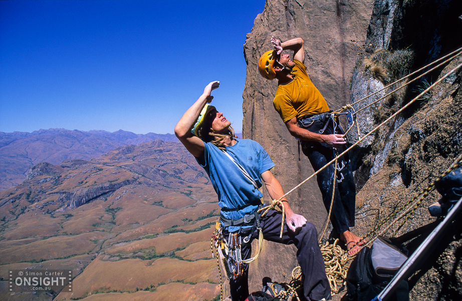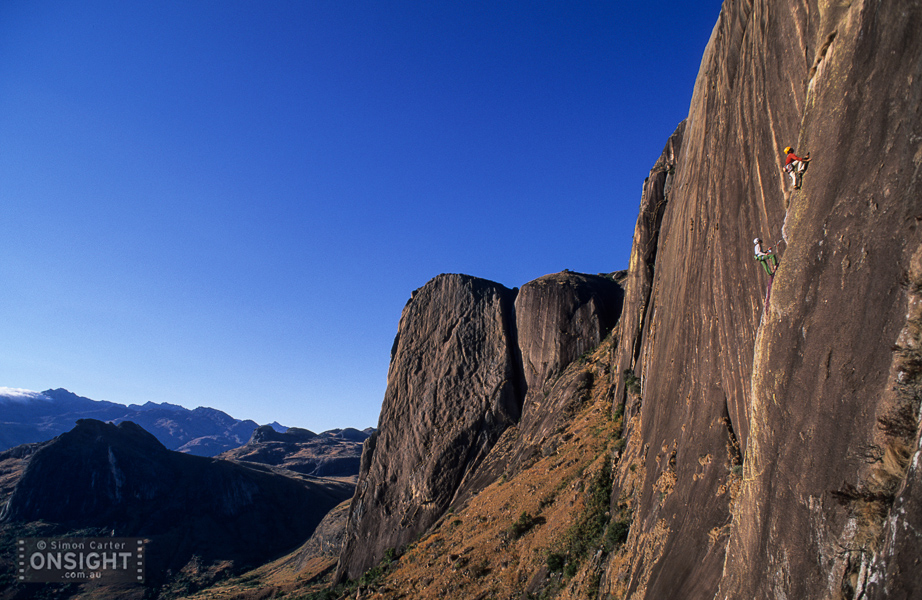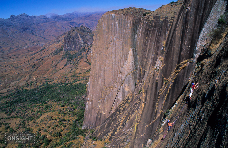 On another flank, on the east face of the Karambony, Team France (Francois Legrand and Greg Sobczak) attempt to free climb the 380-metre Tough Enough (8c+). Certainly the hardest big wall in the southern hemisphere, having ten pitches of highly technical and finger intensive moves up an almost featureless granite wall. It was later free climbed by Adam Ondra in 2010.