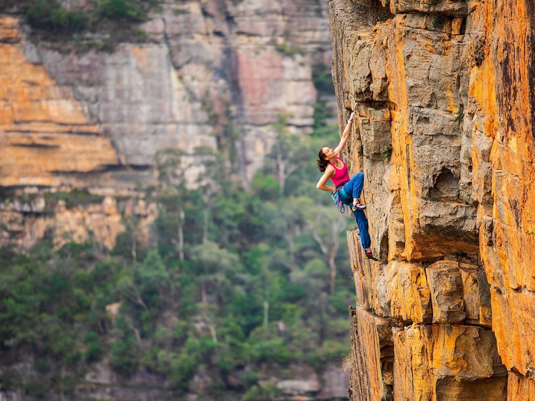 Melissa Mooney @mel_mooney83 styling Weakened Worrier (25), on Ben Trovarto Wall, Sublime Point in the Blue Mountains. This crag was not impacted by the recent fires. But it sounds as…