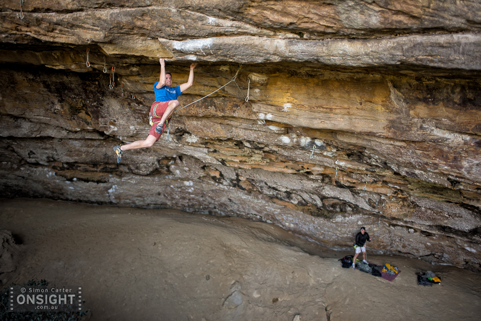 Paul Thomson putting his shoulder to the wheel for a rare repeat of Big Red (27) this morning. This colorful route is a 60m masterpiece originally created by