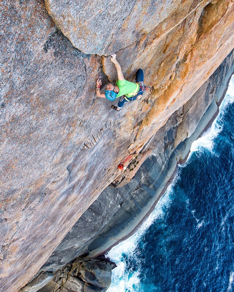 Kate Swain leading Mist-Defied (18), a classy rap-in climb-out affair at Peak Head, near Albany, Western Australia.