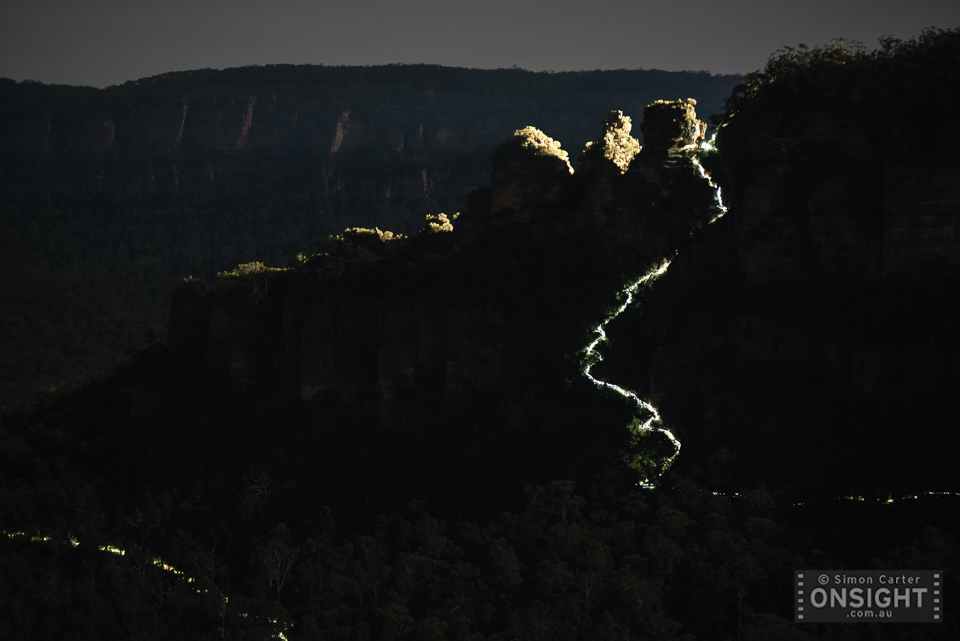 Competitors in the @ultratrailaustralia 100km ultra marathon created a head torch light trail as they descended from The Three Sisters into the Jamison Valley last night. #uta100 #bluemtsaus
