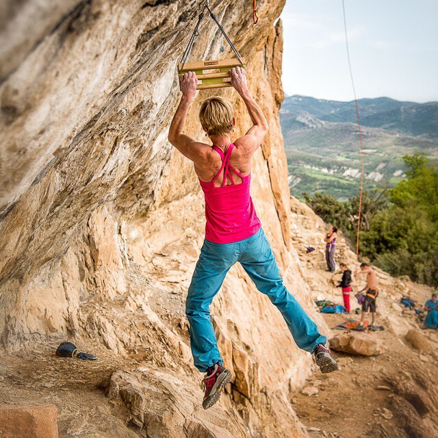 So psyched for @moniqueforestier sending one of the best lines at #Oliana today, the mighty 50-meter tufa wrestling classic, Humildes pa Casa (8b+, 32),