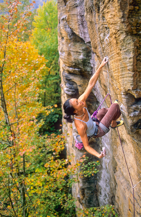 Olivia Hsu eating up Breakfast Burrito (5.10d), Drive-By Crag, Red River Gorge, Kentucky, USA.