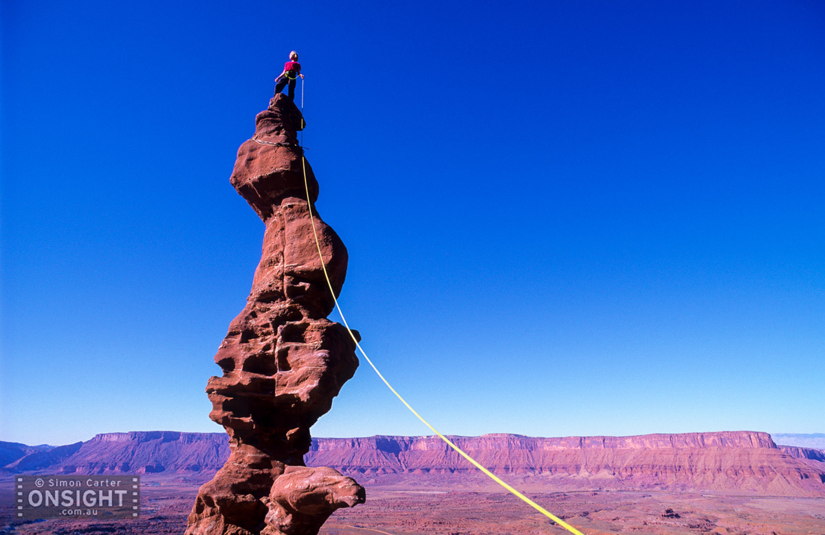 Monique Forestier atop the summit spire of Ancient Art  (5.11a) in the Fisher Towers, near Moab, Utah, USA.