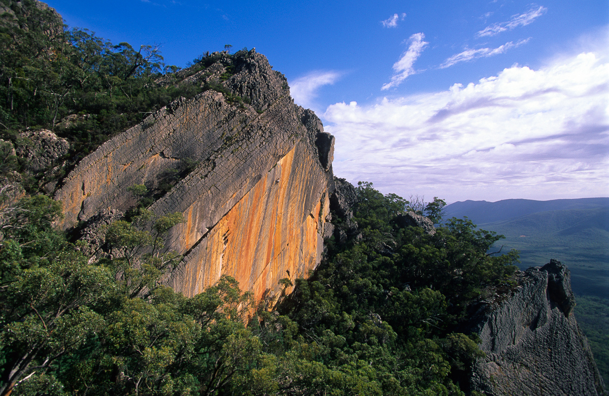 Lynn Hill leading (on-sighting) Archimedes Principle (25) on Eureka Wall in The Grampians, Victoria, Australia. 2000.
