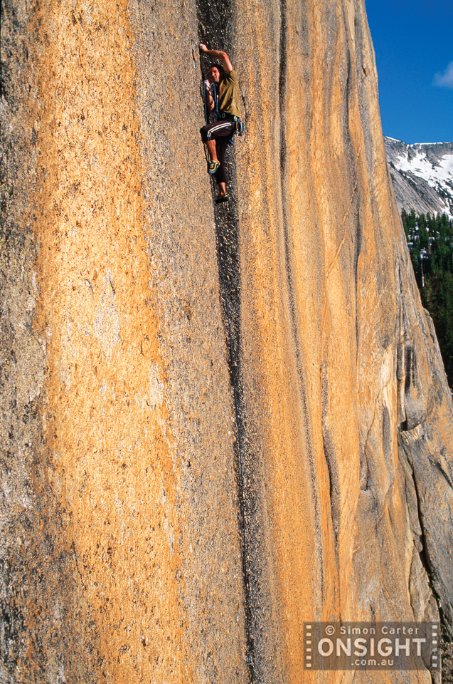 Stefan Schiller leading pitch 2 of the Bachar-Yerian (5.11c) at Medlicott Dome, Tuolumne Meadows, Yosemite National Park, CA, USA.