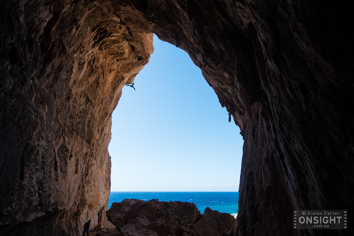 Monique Forestier onsighting Balu Yoghi E Bubu (7b+), Grotta del Cavallo, San Vito lo Capo, Sicily.