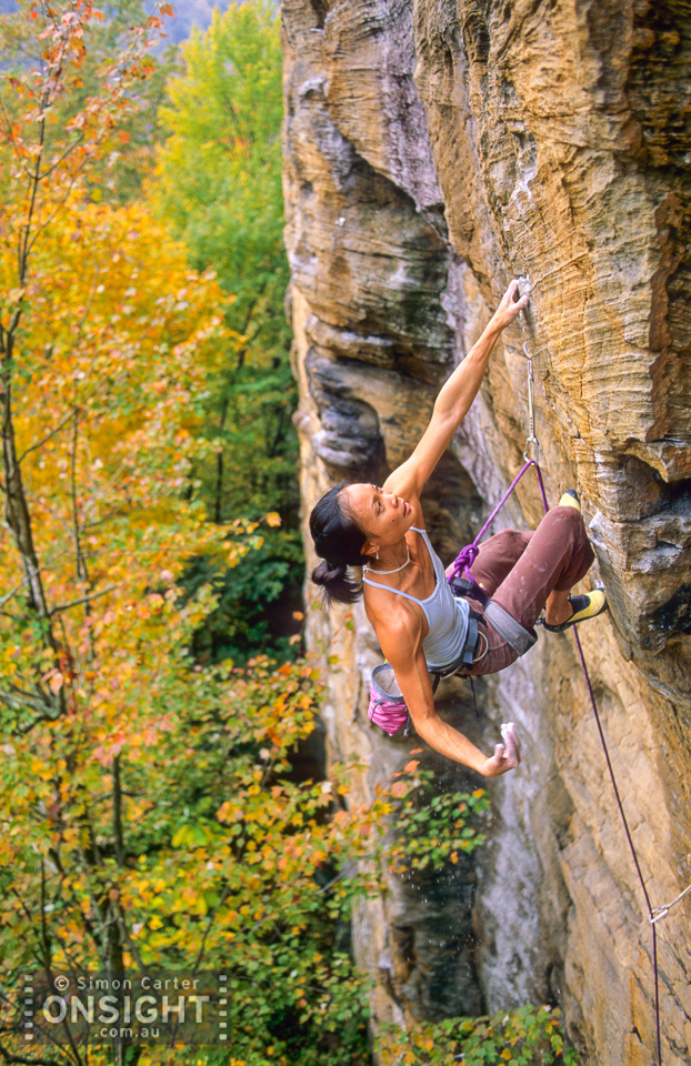 Olivia Hsu, Breakfast Burrito (5.10d), Drive-By Crag, Red River Gorge, Kentucky, USA.