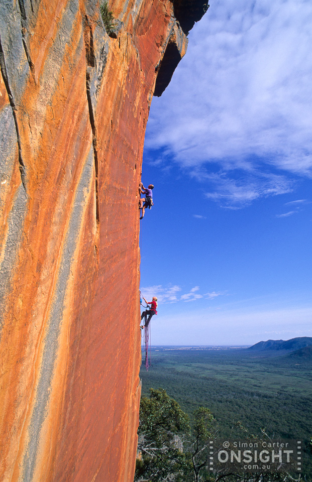 Steve Monks with Monique Forestier belaying on Bristol Fashion (pitch two 26), Red Sail, The Grampians, Victoria, Australia.