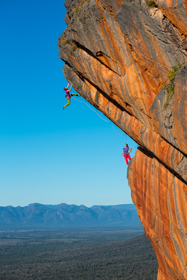 Ashlee Hendy (leading) and Elizabeth Chong (belaying) on pitch two of The Man Who Sold the World (23, 25), Clean Cuts, Grampians, Victoria, Australia.