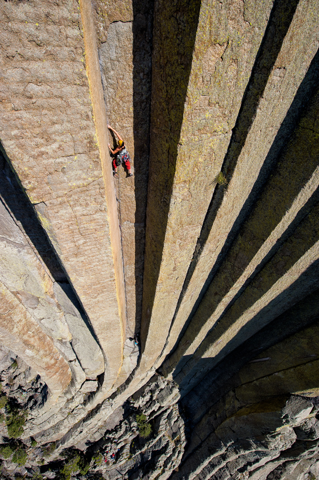Crystal Davis, El Matador (5.10d), Devils Tower, Wyoming, USA.