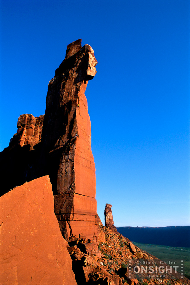 Greg Child leading pitch two of his Excommunication, a major route on The Priest, with pitches of 12b, 12a, 13a, 11b, 10d. Castle Valley, near Moab, Utah, USA.