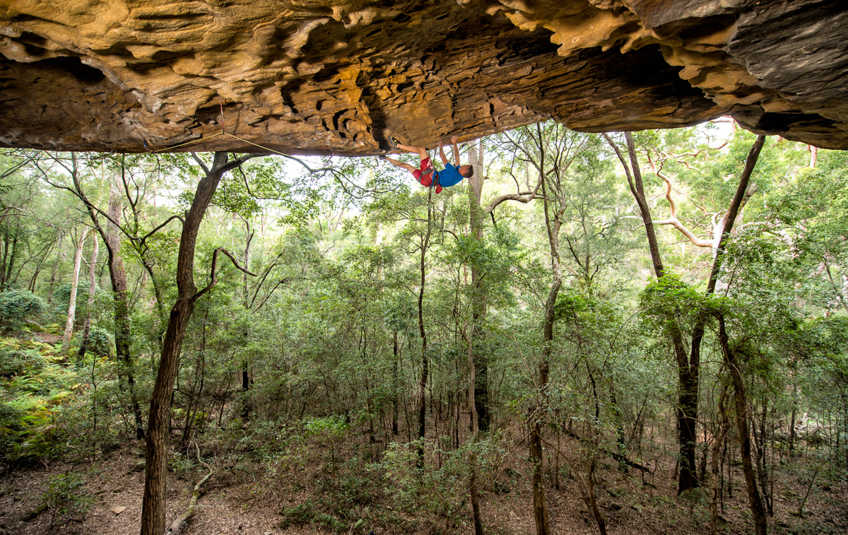 Sean Powell on the 22 meter roof climb Ghetto Superstar (28), at The Hideaway, in suburban Sydney (near Campbelltown), NSW, Australia.