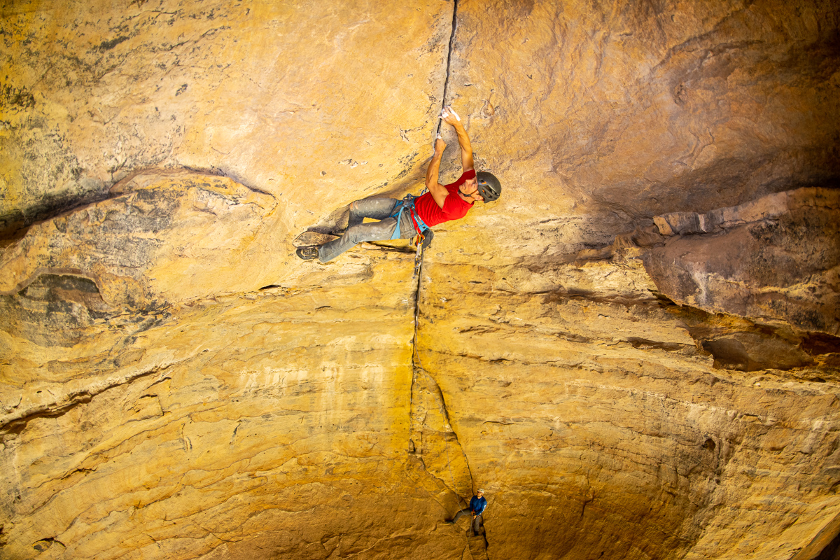 Jacques Beaudoin on his Great Divide (28). A trad roof crack, on the Newnes Plateau, Blue Mountains.