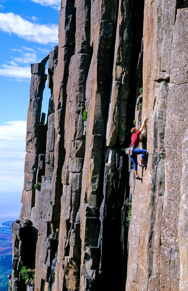Roger Parkyn on his two pitch classic, In Flagrante Delicto (24), The Amphitheatre, Mount Wellington, Tasmania, Australia.