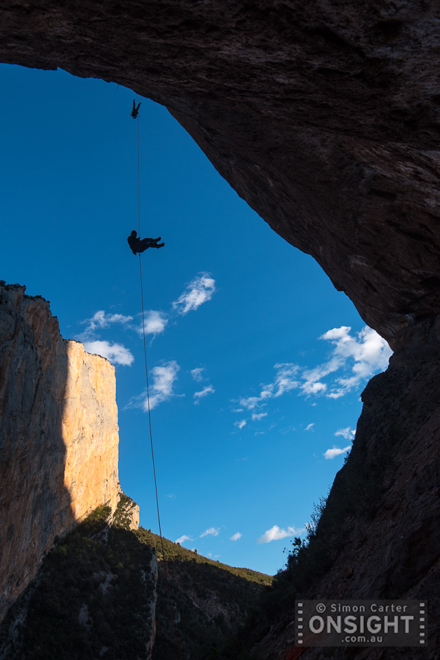 Chris Sharma and Klemen Becan descend after a hard days work on their hard muliti-pitch project, Mont-rebei, Spain.
