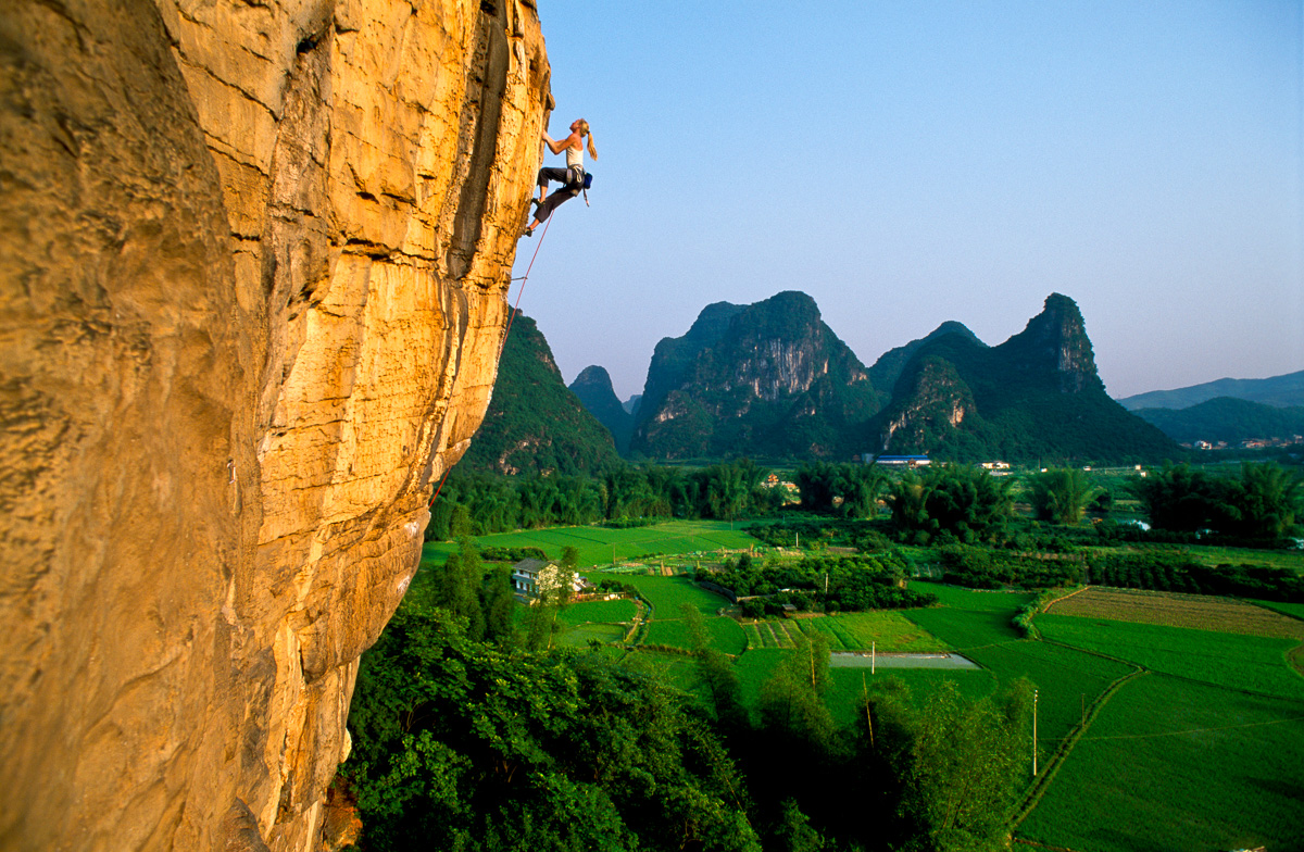 Monique Forestier attempting Nine Deep, One Shallow (5.13d), Banyan Tree Crag, near Yangshuo, China.