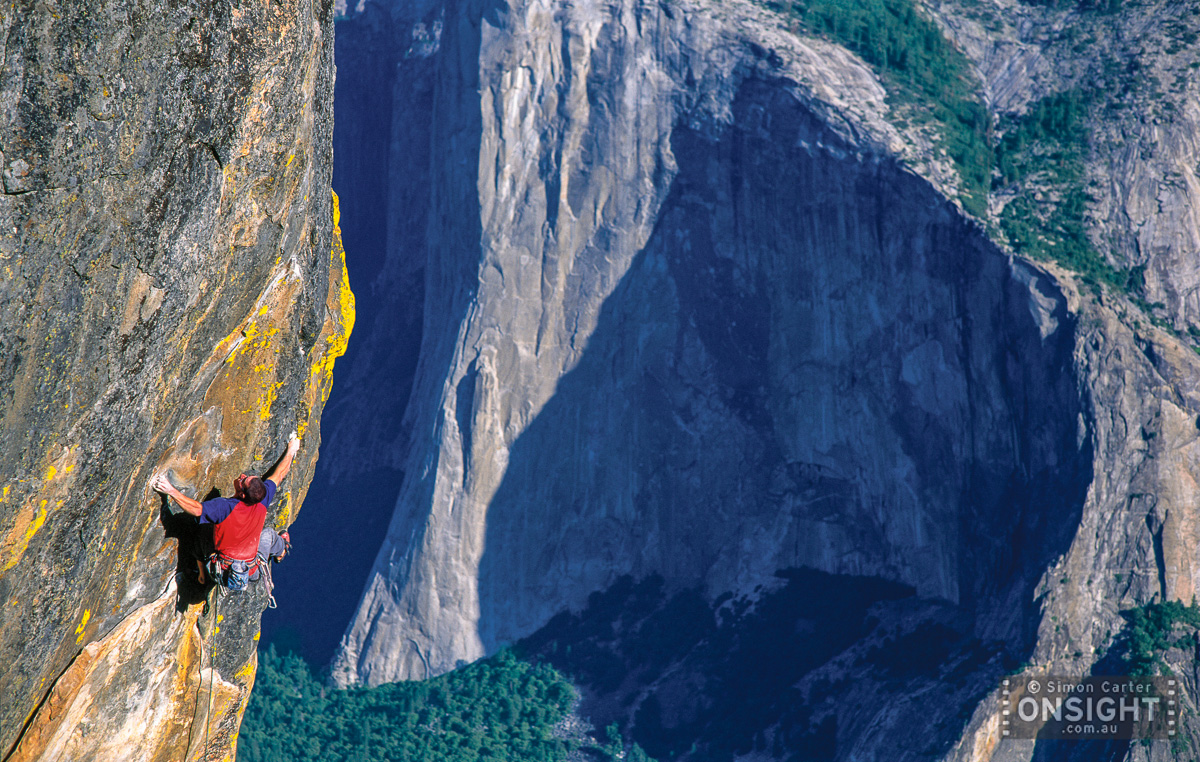 Cedar Wright on Notes From The Underground (5.12d) at Taft Point with El Capitan in the background, Yosemite, CA, USA.