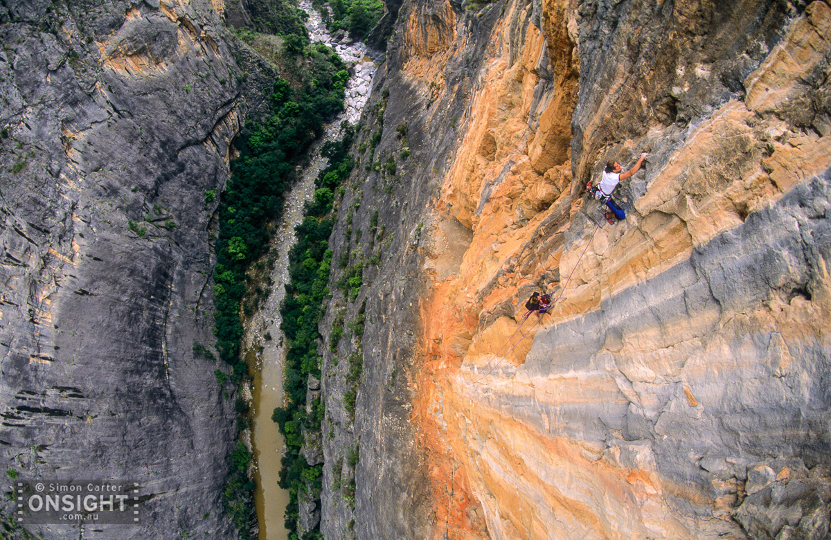 Mike Weeks leading (and Chris Jones belaying), pitch seven (crux) Overture to the Sun (26), at Bungonia Gorge, NSW, Australia.
