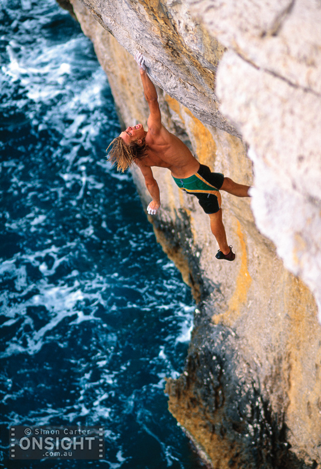 Leo Houlding trying to pull off a massive “dyno” move on the cliffs of Panitula Island, near Kornati, Croatia.