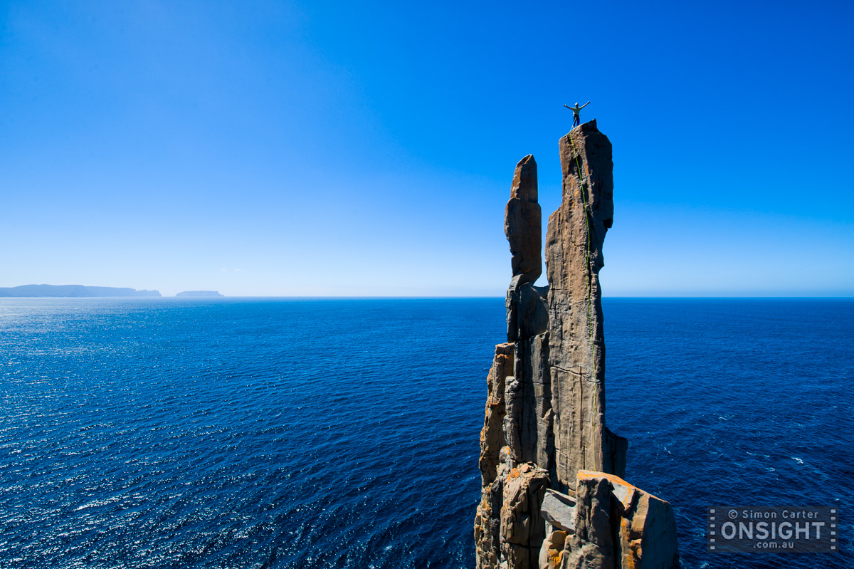 Steve Moon atop Pole Dancer (22) at the end of Cape Raoul, Tasman Peninsula, Tasmania, Australia.