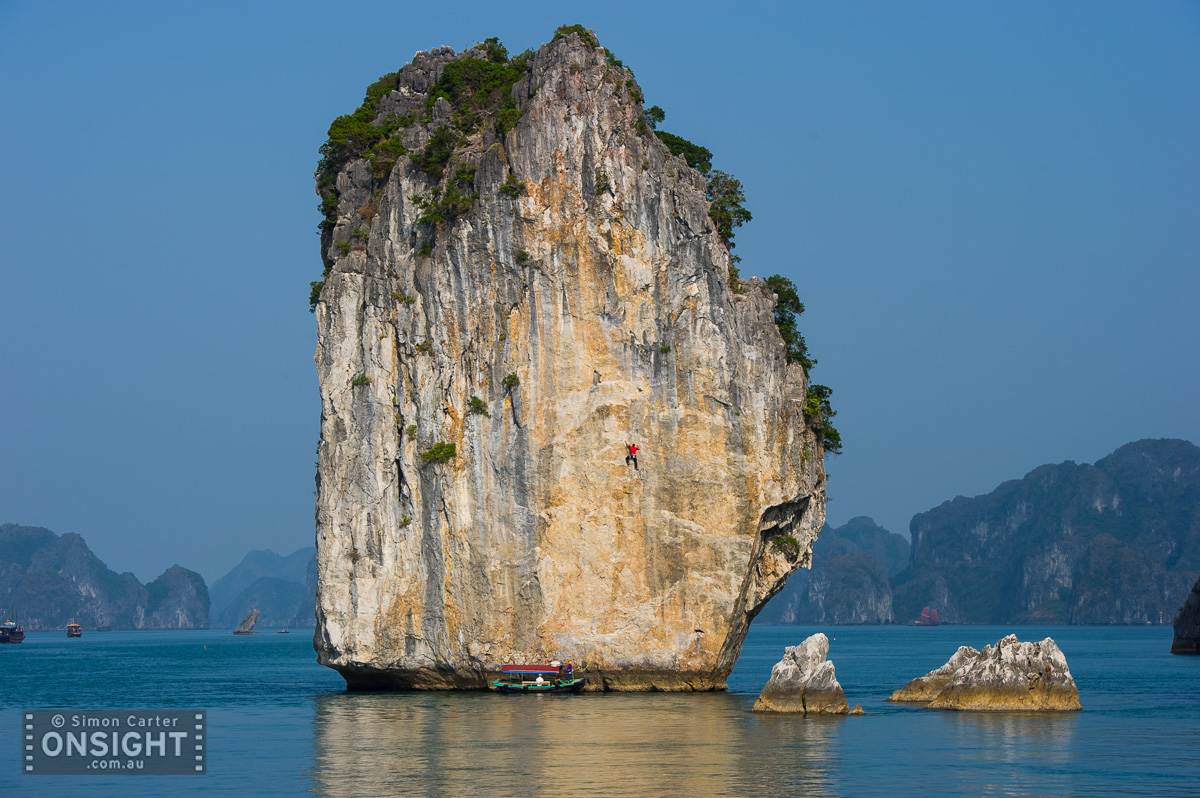 Lee Cujes leading the rebolted Saigon Wall (7a), Halong Bay, Vietnam.